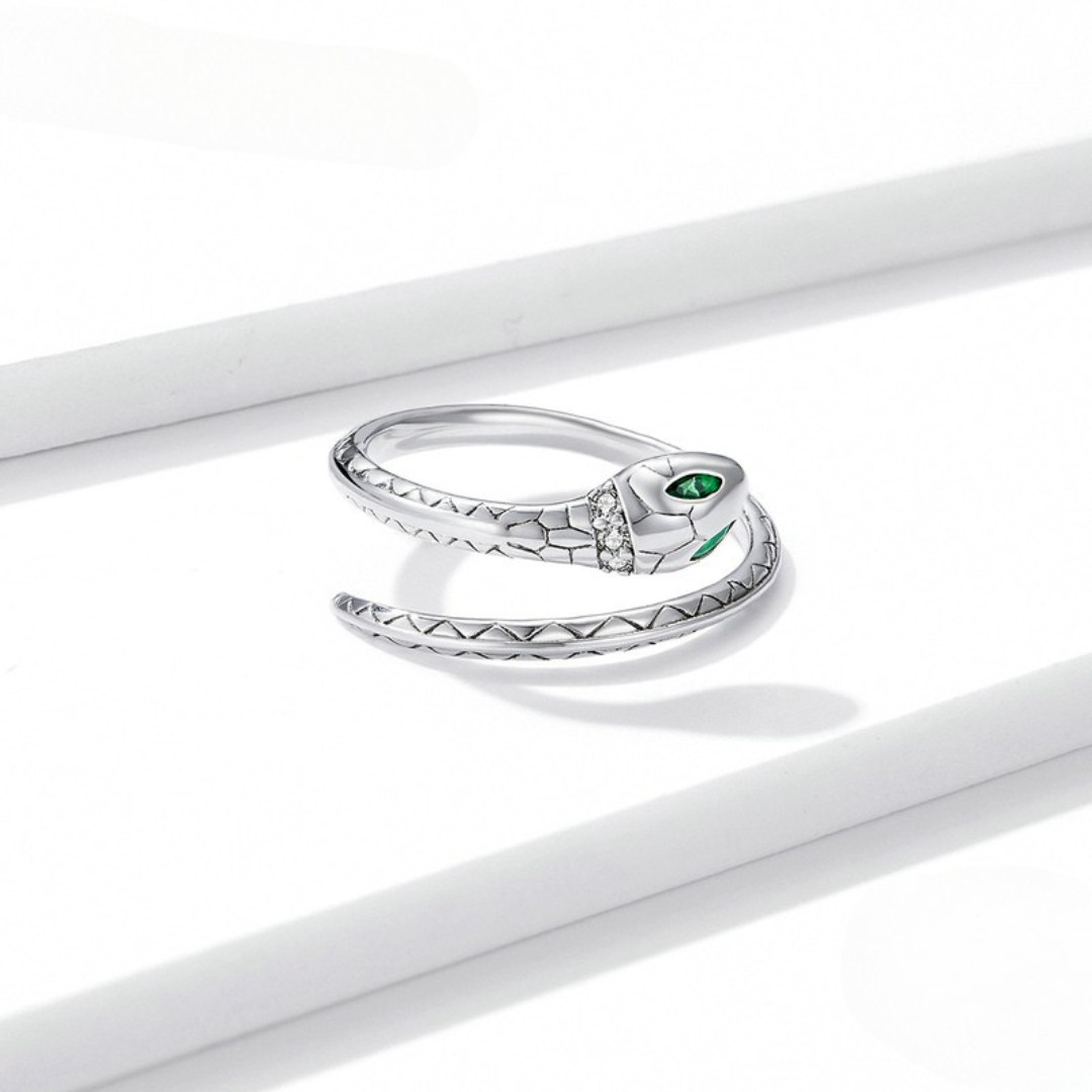 Anel ajustável em Prata 925 legítima com design vintage em formato de cobra, olhos em zircônia verde e detalhes texturizados que trazem um toque místico e elegante.