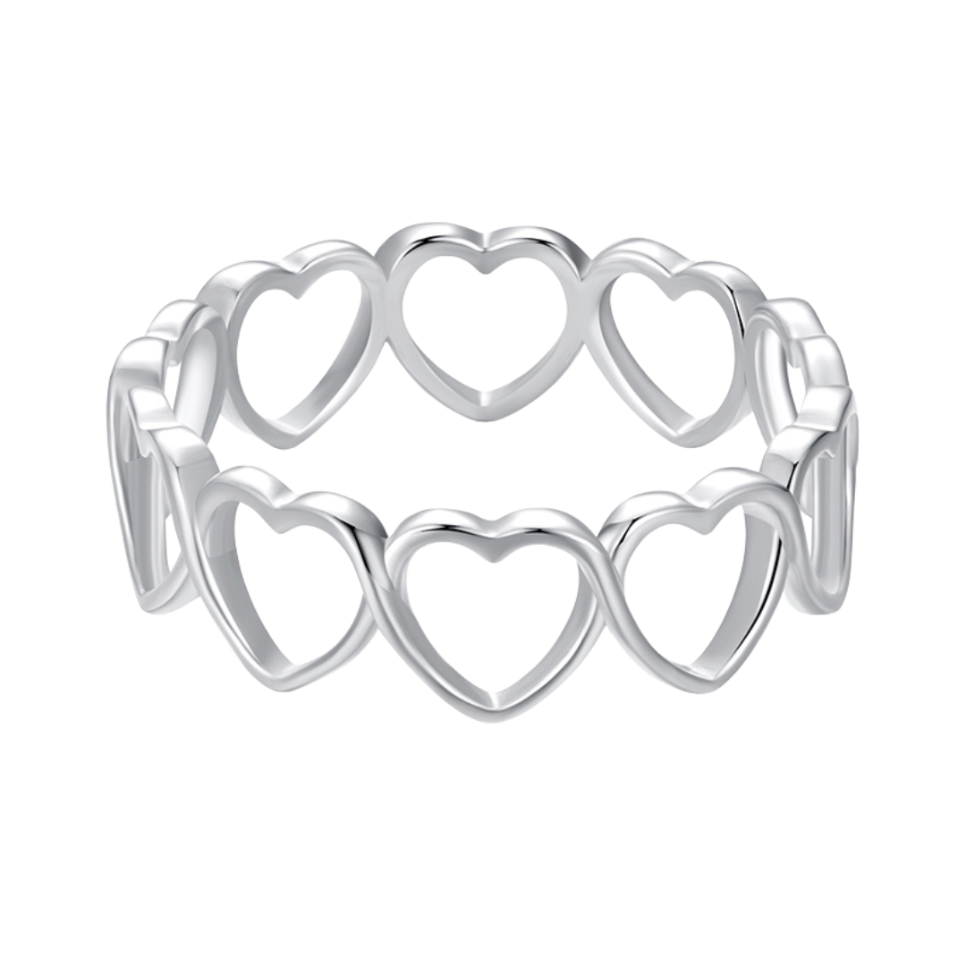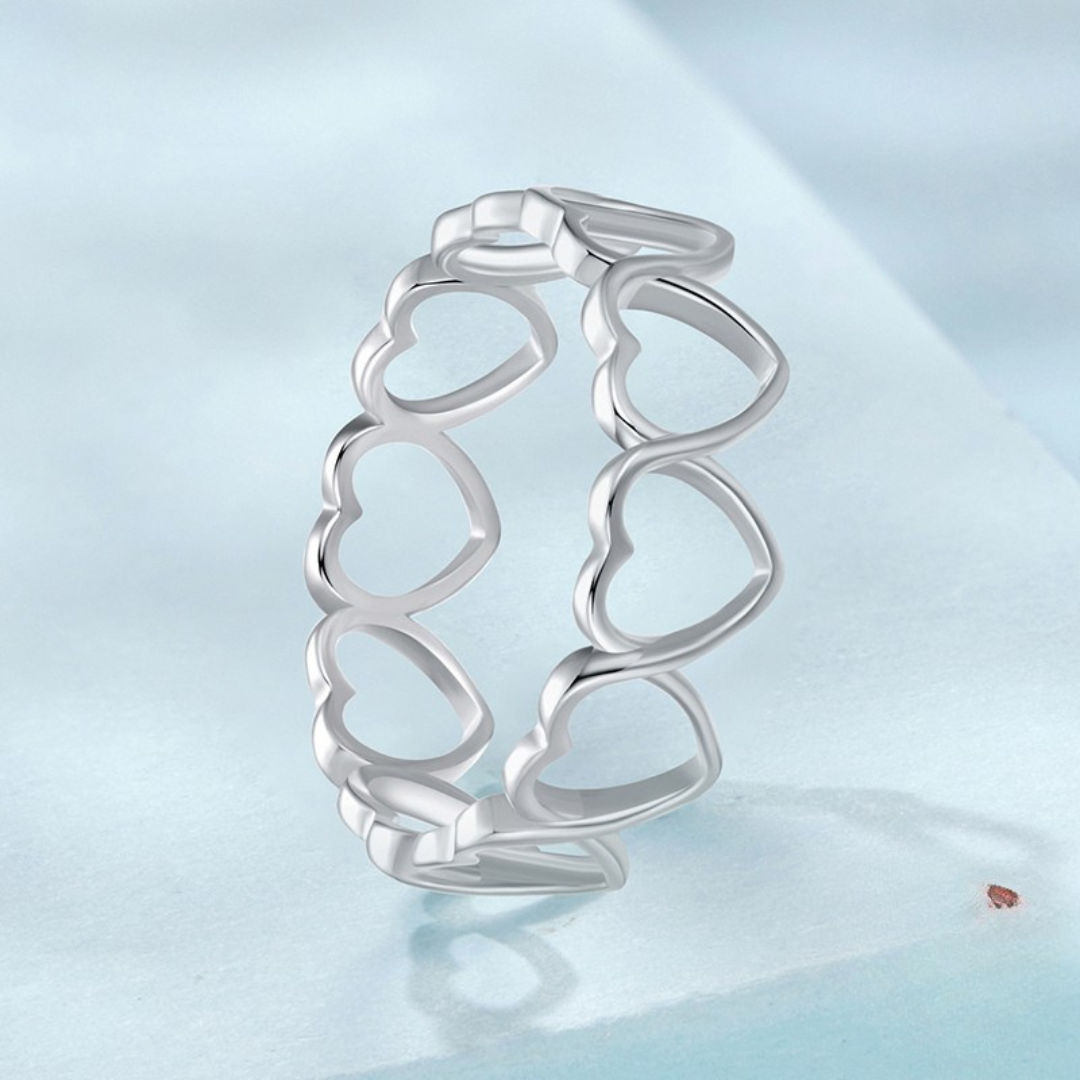 Um símbolo delicado de amor e conexão, este anel apresenta uma sequência de corações vazados em um design elegante e minimalista. Ideal para presentear quem se ama – ou para representar o amor-próprio de forma sutil.