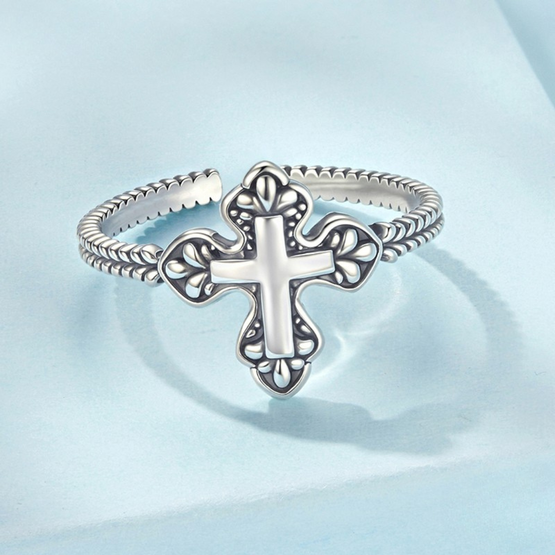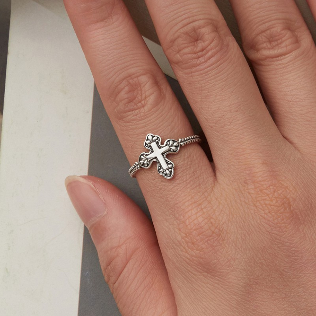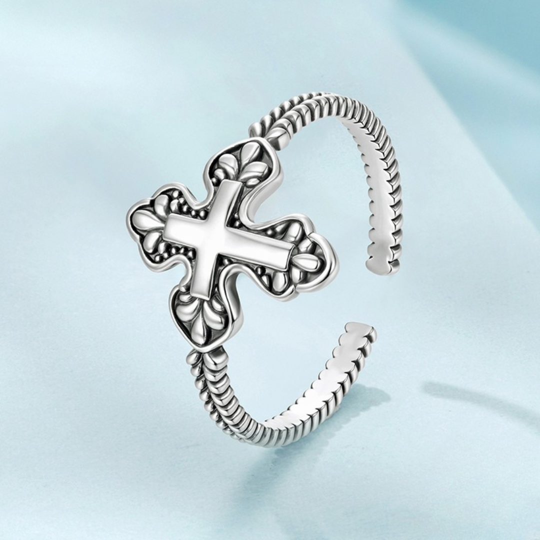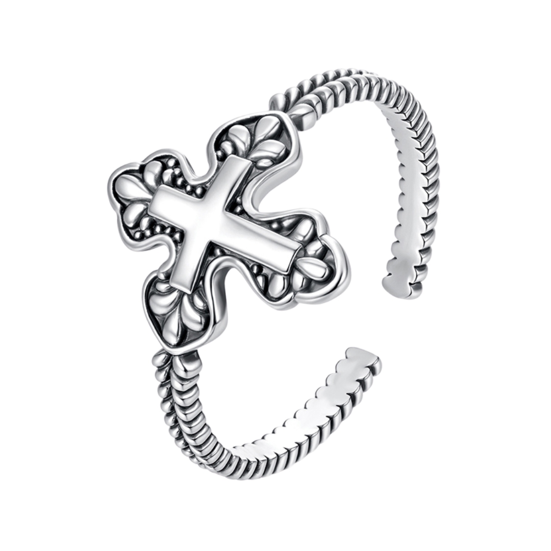 Símbolo de fé, proteção e conexão espiritual, este anel traz uma cruz em destaque com acabamento envelhecido e detalhes retrô no aro torcido.