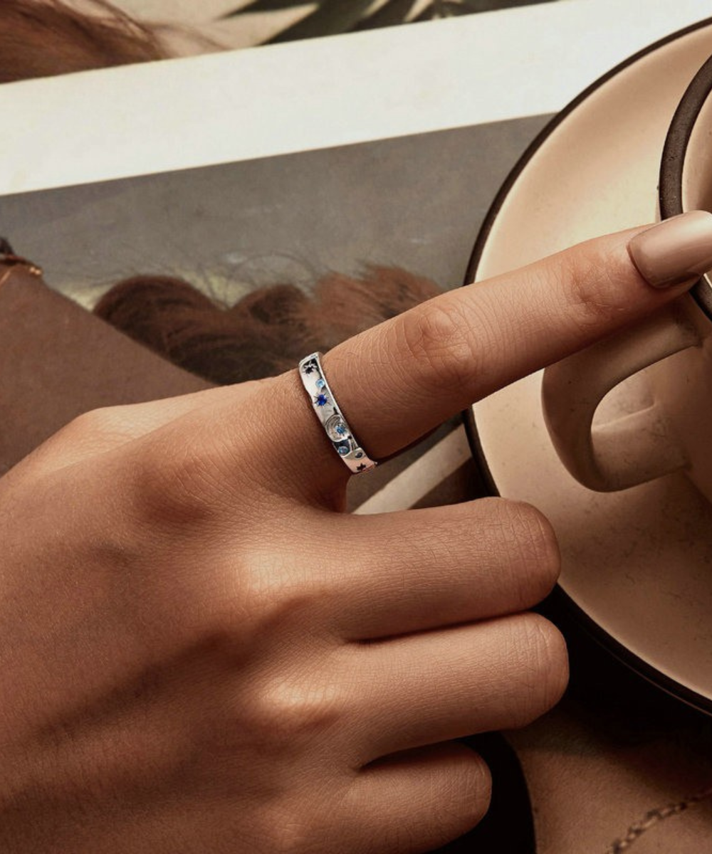 Anel fechado em Prata 925 legítima, com design clássico e elegante inspirado no céu noturno. Com detalhes de estrelas e luas gravadas e pequenas zircônias azuis, a peça simboliza brilho, inspiração e serenidade, ideal para mulheres que gostam de acessórios sutis e cheios de significado.