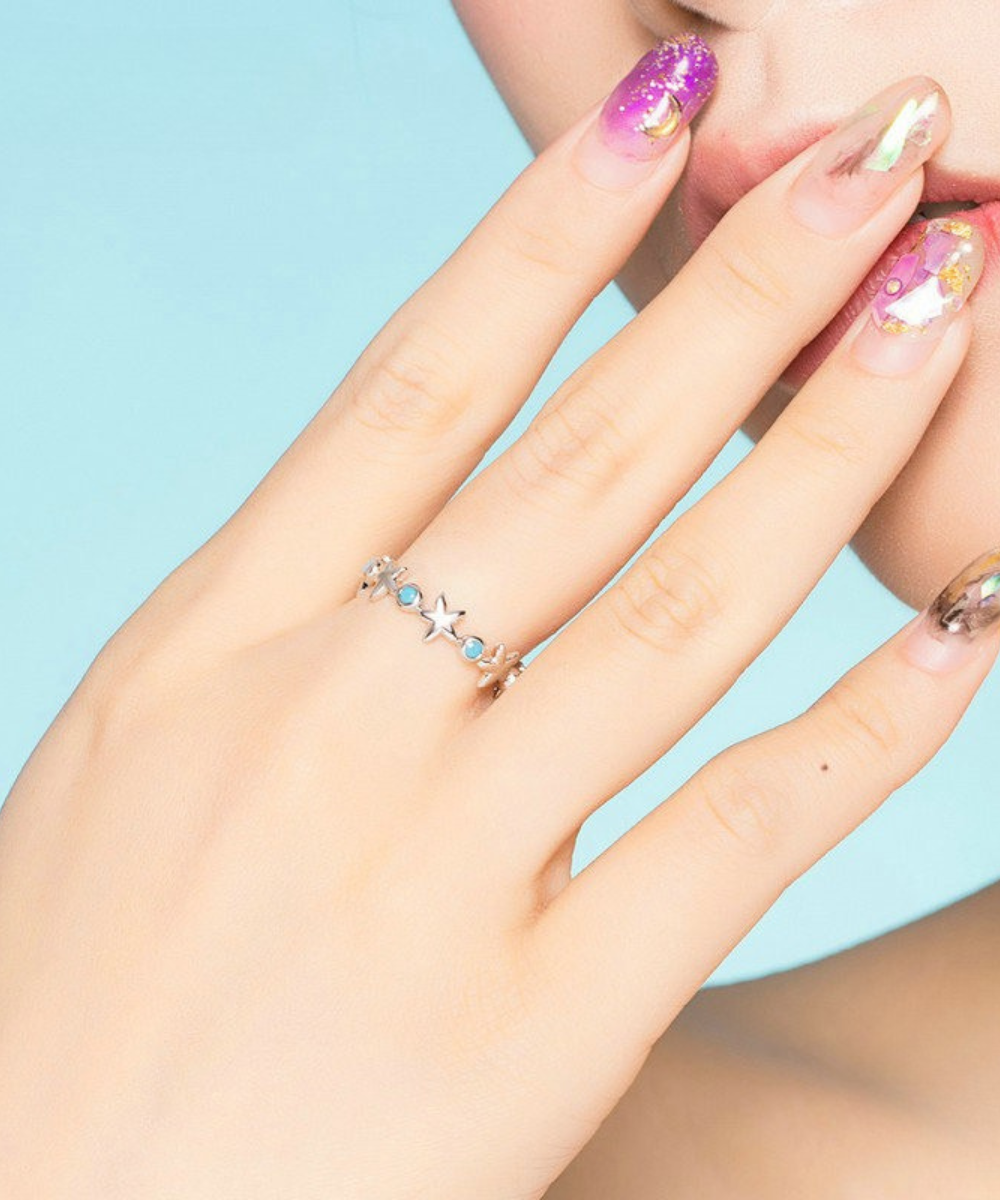 Inspirado nas belezas do fundo do mar, este anel traz um delicado conjunto de estrelas do mar intercaladas com pedras zircônias azuis, formando uma composição harmoniosa e cheia de frescor. Um toque de verão, liberdade e alegria para quem ama a natureza marinha.