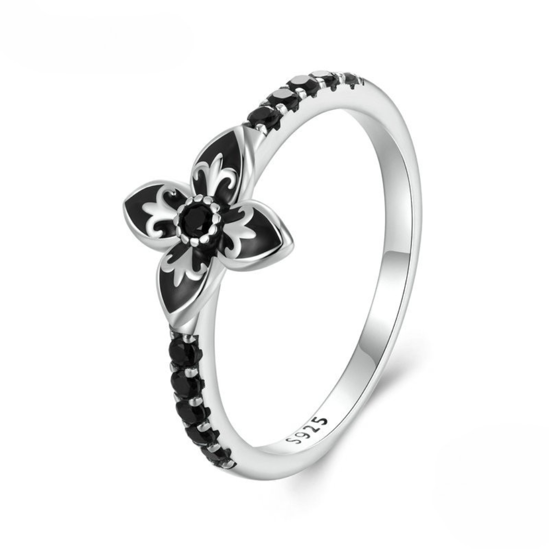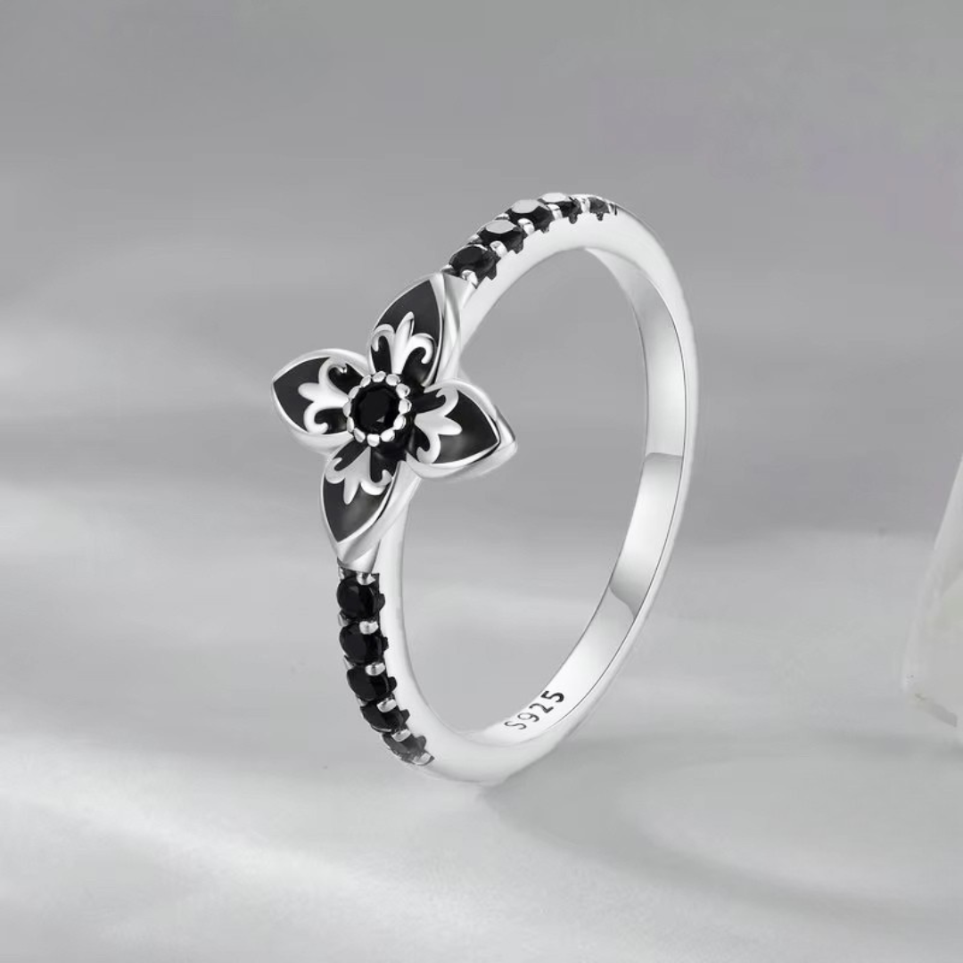 Anel Flor da Noite com Zircônias Negras Prata 925