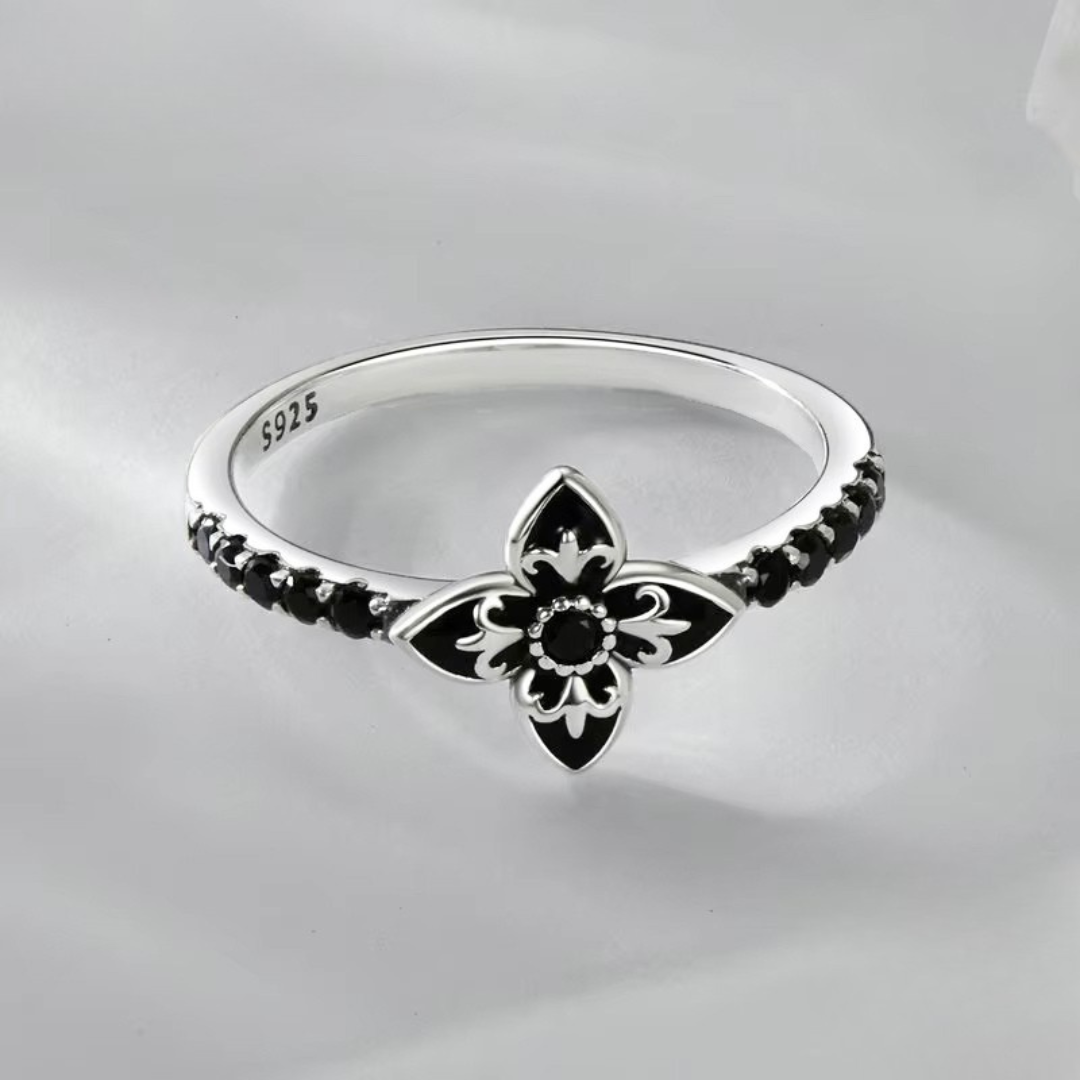 Anel em Prata 925 legítima, com design clássico e detalhado inspirado em uma flor escura, trazendo um toque de mistério e requinte para compor looks modernos e marcantes.