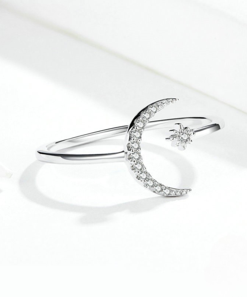 Com um design delicado e romântico, este anel traz a imagem da lua crescente adornada com micro zircônias e uma pequena estrela em destaque. Uma joia que simboliza a proteção, os ciclos e a força feminina, perfeita para quem se conecta com a beleza e a magia do universo.