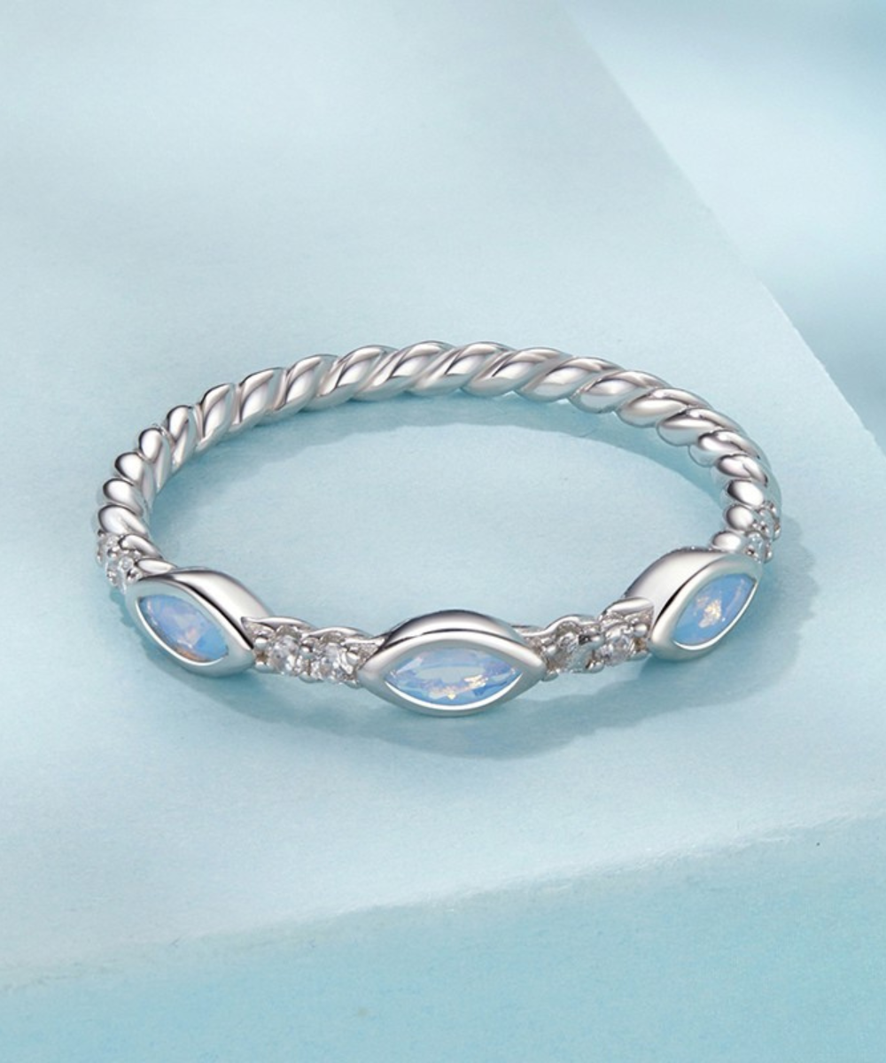 Este anel delicado e sofisticado combina o brilho etéreo da opala branca com um design elegante de formas ovais, trazendo leveza e harmonia para quem o usa. As pedras opalinas refletem suavemente a luz, remetendo à neblina da manhã e aos encantos sutis da natureza.