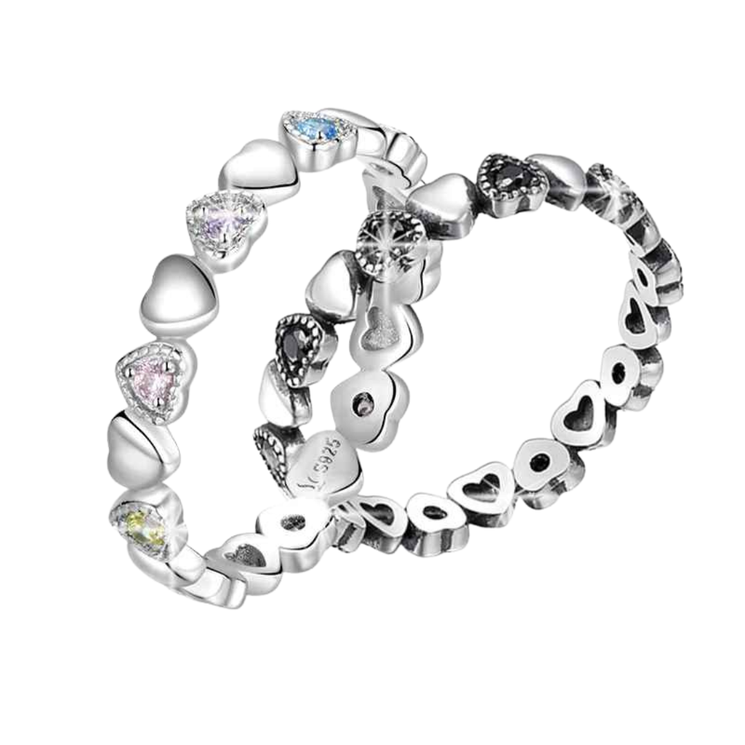 Um anel encantador e moderno, feito em Prata 925 legítima, com design de pequenos corações e cristais coloridos que criam um efeito arco-íris delicado e cheio de charme.